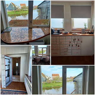 B&B Scheepjeserf: het mooie "stuiver" tafeltje met lekkere stoelen en uitzicht op het water, de douche in de bankkluis, een prachtig ladenkastje als keukenblok.